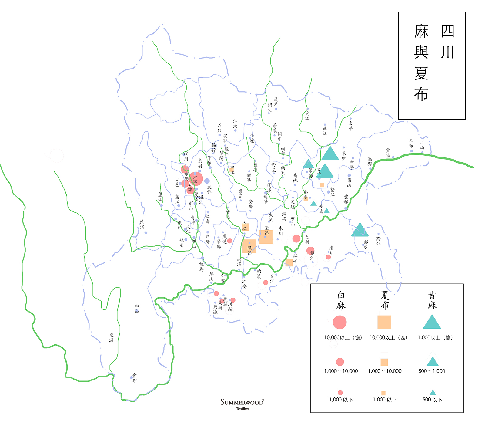 白麻因各地土壤、氣候、培植之不同,亦有優劣之分。榮昌、隆昌、內江之麻,品質最佳,通稱家麻,為千四以上細夏布之唯一原料。他處白麻稱為山麻,有珙縣、高縣、筠連、江安、敘永、長寧各縣。其來自下河者,有江津、南川、合江、江北各縣。更有鄰水、綦江、榮威一帶所產之山麻。榮、隆、內各縣為川產夏布之中心,因當地所產之麻,不足供製造之用,故多由外縣輸入。川西如溫江、灌縣、郫縣、崇慶亦產白麻,專供中江製布之用。